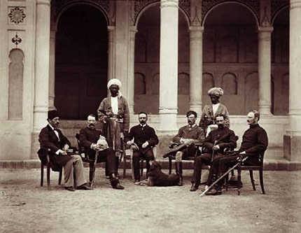 SN: Amazingly, we almost have the makings of an anthropological experiment. Whilst Burke is making his best work, another photographer arrives in Afghanistan, this time in Kandahar. Named Benjamin Simpson, he is a doctor with the British Army and a more accurate mirror of the Empire's values. He photographs many of the same motifs as Burke but the difference is startling. When he photographs group portraits, the sitters look downcast and oppressed and in one of his group portraits of Englishmen and Afghans, the typical racial hierarchies are ruthlessly enforced; the Afghans are standing, the English are sitting; and the dog is sitting too!