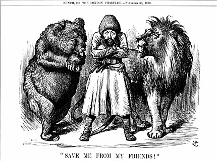 Punch, November 30, 1878. The Afghan Emir is seen sandwiched between the Russian Bear and the British Lion.